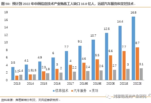 从熟练工人供需差距的角度出发,在三个细分赛道中信息技术职业技能教育的发展将会更加快速。根据弗若斯特沙利文的报告,预计到2022年中国信息技术产业熟练工人缺口将会达到16.8亿人,远超同期汽车服务8.7亿人和烹饪技术3.1亿人。