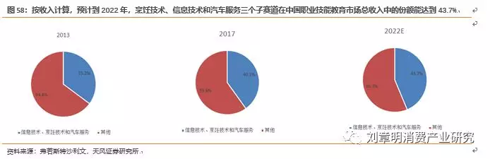 就细分赛道而言,按收入计算,烹饪技术、信息技术和汽车服务的收入之和占2013年中国职业技能教育市场总收入的35.2%。根据弗若斯特沙利文报告,三个细分赛道的总市场份额于2017年增至40.1%, 并预计于2022年将增长至43.7%,主要系相关就业市场需求不断上升及人们具有加强就业技能的强烈意愿所致。
