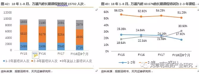 在万通汽修长期课程新培训人次构成中,2-3年课程依旧占主体(占比51.25%但创历史新低),对应新培训4935人次。与此形成对比的是,3年及以上课程新培训人次占万通汽修新培训总人次的比重不断提升,18年1-8月已经达到30.93%,对应新培训2979人次。