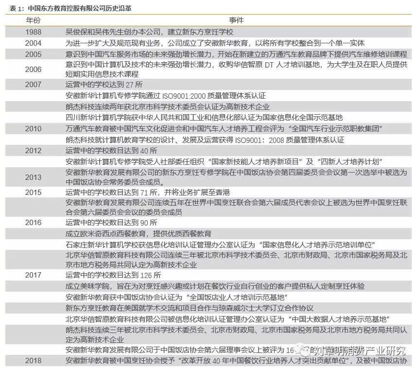 公司在1988年由吴俊保先生及吴伟先生创办,目前按年度平均培训人次计,公司是中国最大职业技能教育提供商,通过新东方烹饪、欧米奇西点西餐、新华电脑、华信智原DT人才培训及万通汽修五大知名品牌经营业务及设立学校。公司烹饪起家,逐步扩展至汽修和计算机培训,五大品牌和美味学院构成完整品牌体系,课程紧贴市场需求。18年12月6日,公司提交招股书拟赴港上市。