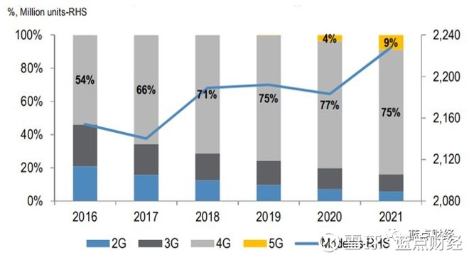 根据Gartner的预测,5G手机的出货量在2020年将达到手机总出货量的4%,2021年达到9%,另外5G上网设备(调制解调器)的出货量在2019年将达到500万台,到2020/21年急剧上升到8000万/2亿台。