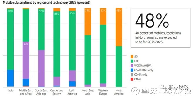 根据爱立信推出的2023年各制式移动通信技术份额展望,5G在北美将达到48%的渗透率,而在东北亚将达到34%,在西欧则只有21%。