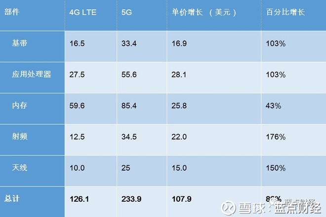 为了评价相比于LTE竞争对手而言的5G智能手机半导体含量增长的机会,摩根大通确定了相关组件(如处理器、内存、射频等)整体物料清单(BOM)的成本分析,结果表明,相比高端LTE手机,高端5G手机成本在2019年将增价110美元左右,这意味着相关智能手机组件的市场增长了约85%。