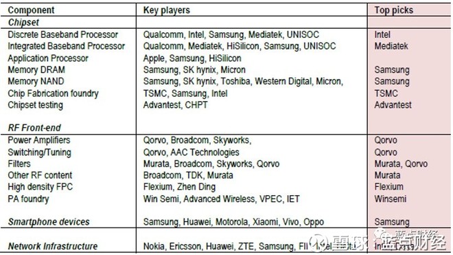 表1:主要5G半导体供货商