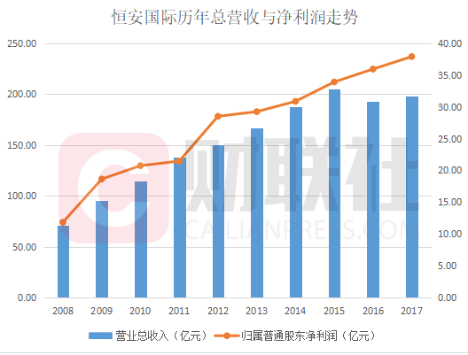 事实上,近十年来,恒安国际业绩持续上涨,公司总营收由2008年的70.56亿,增长到2017年的198.43亿,增幅高达181.22%;同期净利润也由11.83亿,增加到37.94亿,增幅为220.71%。下图为财联社根据财报绘制的恒安国际历年总营收与净利润走势: