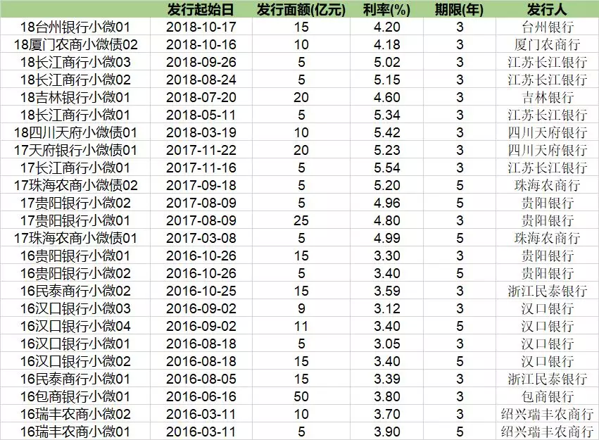 下表为2016年来银行发行小微专项金融债的情况: