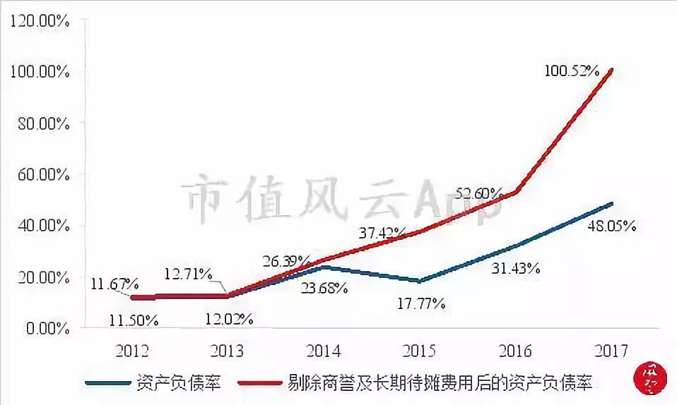 从上图看,公司的资产负债率持续攀升,如果剔除商誉及长期待摊费用这两项虚拟性质的资产,2017年,公司实际资产负债率高达100.52%。也可以说,剔除商誉和长期待摊费用后,公司每一元的资产对应着每一元的负债。
