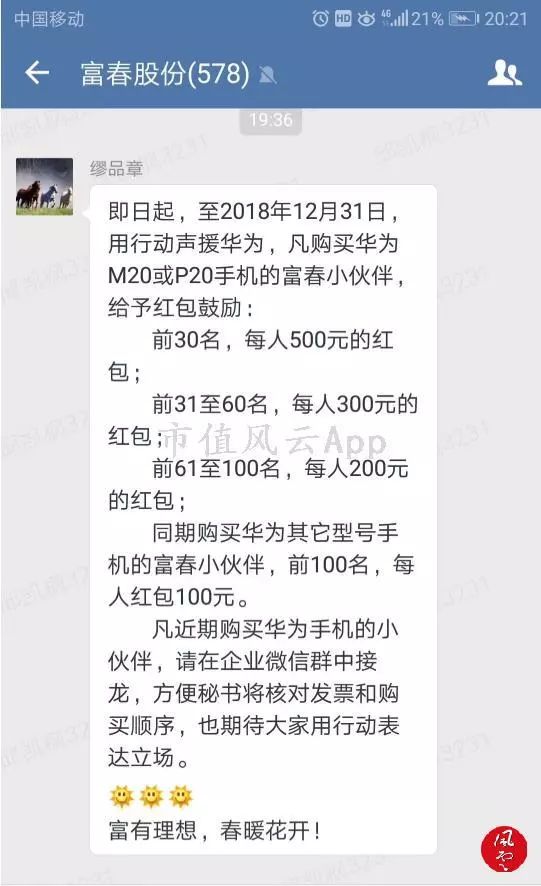 富春股份(300299.SZ)日前以实际行动声援华为。富春股份董事长、实控人缪品章带头使用华为手机,更于12月11日发出倡议:凡购买华为系列手机的富春员工,均给予红包鼓励。其中,前30名购买的员工每人奖励500元的红包,前31至60名每人300元的红包。