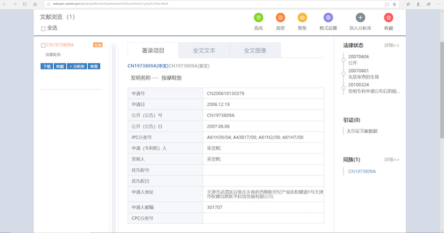 逐一排查后发现,权健自然医学科技发展有限公司共提交过约11项发明专利申请,其中1项处于审查中,6项已无效。在被授权的4项发明专利中,两项关于按摩鞋和鞋垫,一项关于火疗精油,一项关于治疗胃炎的中药。