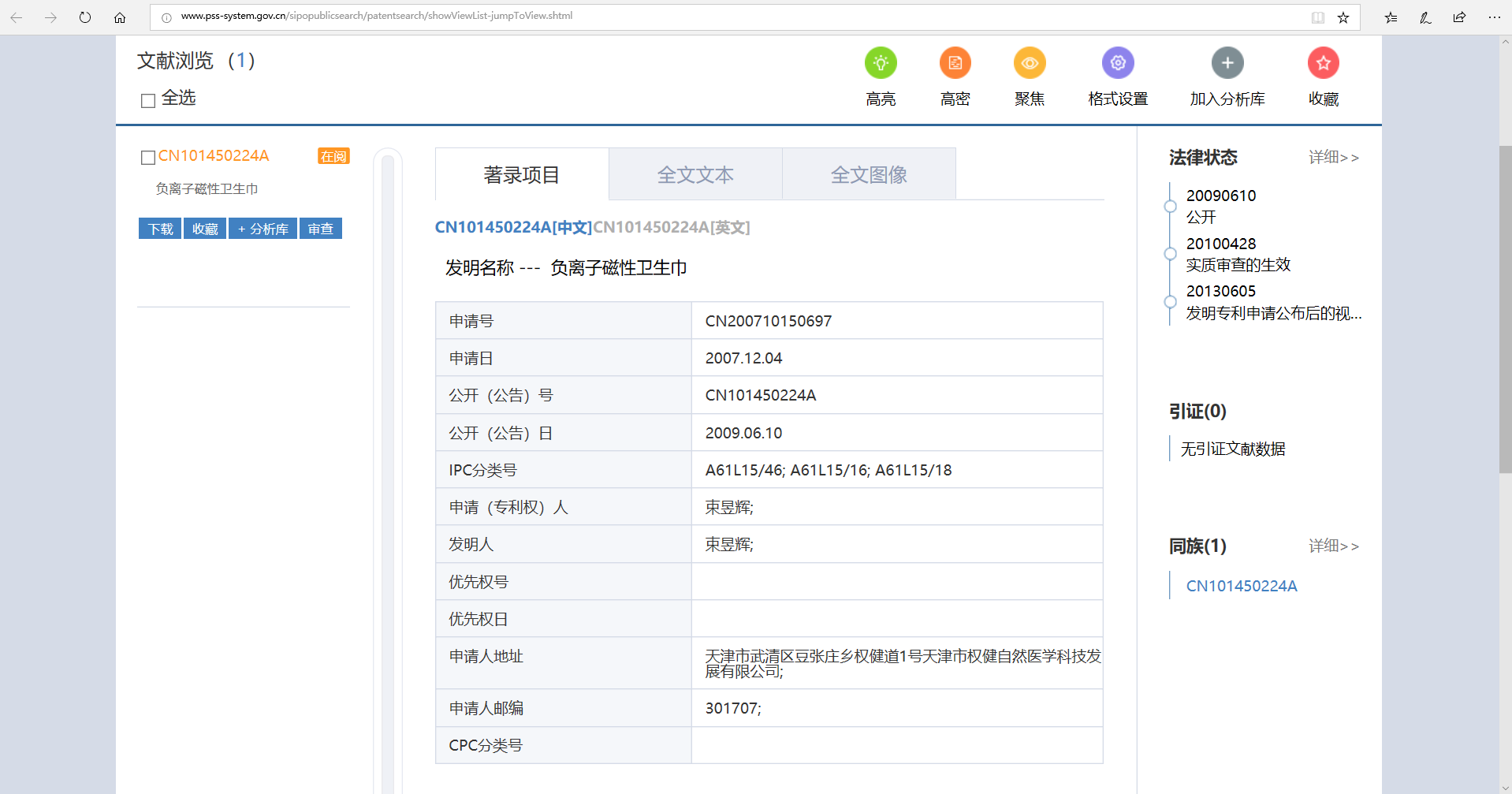第一财经记者在国家知识产权局网站,用权健集团董事长束昱辉作为发明人检索,发现了40项专利申请,且其发明专利申请多数处于失效状态。最新的专利是“一种火疗体用精油及其制备方法”(【公开】同族:2引证:6被引:0),申请日: 2017.09.05,申请号: CN201710789915。