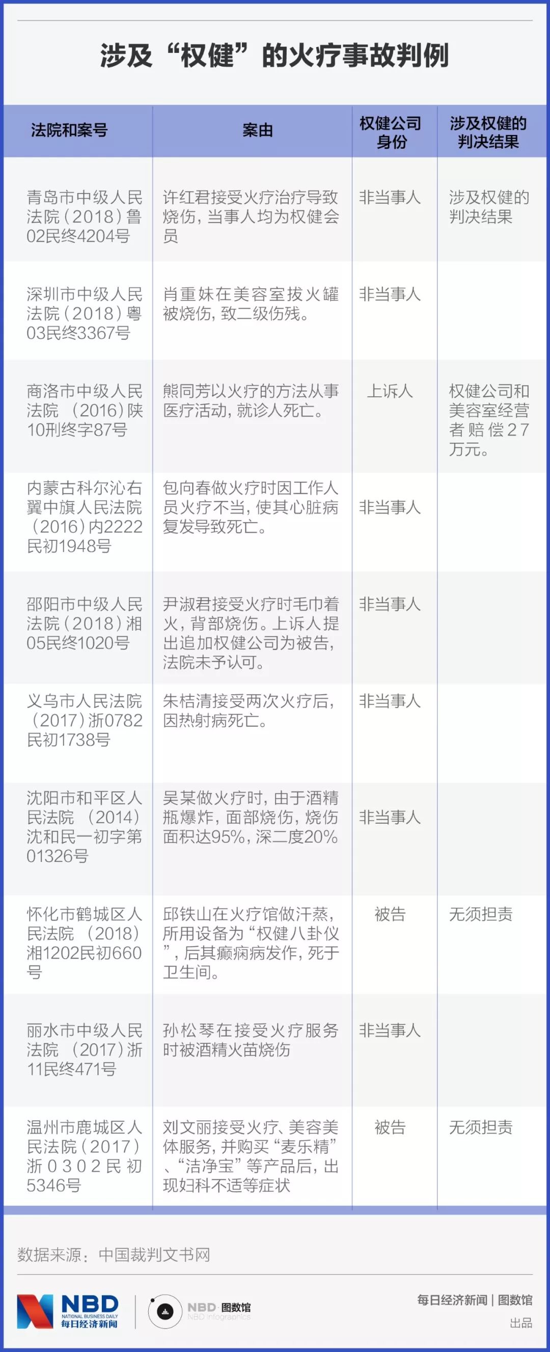 2016年3月,深圳顾客肖重妹在“权健自然医学美容院雅丽工作室”拔火罐时因工作人员操作不当,导致右上肢、胸腹及后背等多处皮肤被酒精火焰烧伤,后接受了整形治疗。肖重妹随后将权健公司和美容室人员告上法庭,2018年5月深圳中院作出终审判决,权健公司和涉事的权健美容室人员一起承担责任,共计赔偿27万元。