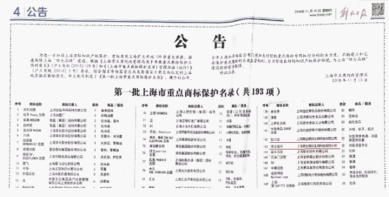 2018年11月15日解放日报第4版公告:第一批上海市重点商标保护名录,脑白金、黄金搭档被纳入首批上海市重点商标保护名录。