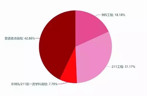 根据统计结果,细分之下以普通重点高校为主,占比42.86%。普通重点高校通过吸纳人才来强化师资团队,提升学校水平。但若分成“双一流”学科建设高校与非“双一流”高校两档,则会发现约58%的高校都是“双一流”大学。