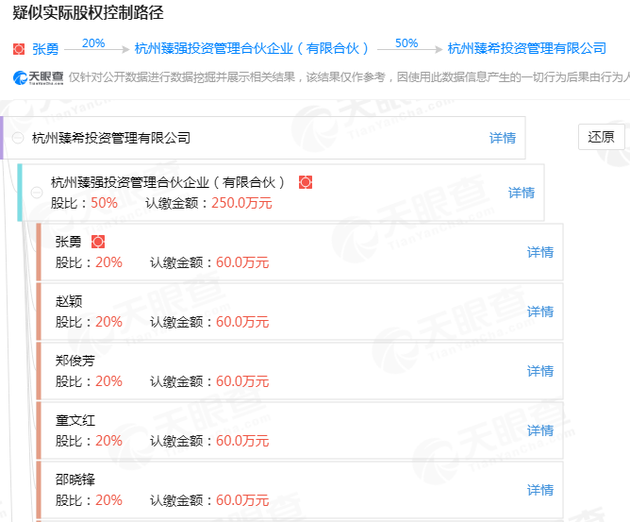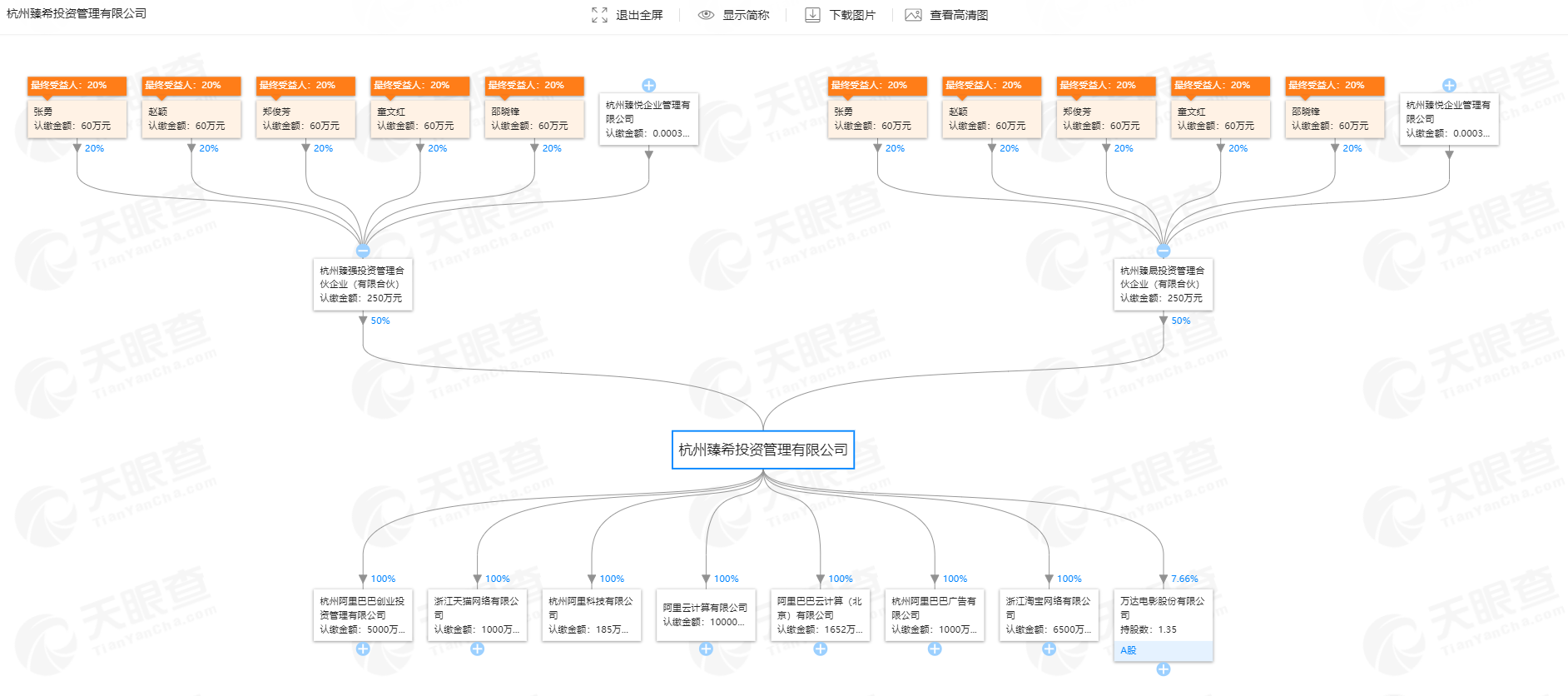 天眼查数据显示,杭州臻希注册资本500万元,由杭州臻强投资管理合伙企业和杭州臻晟投资管理合伙企业各持股50%。经股权穿透,张勇、赵颖、郑俊芳、童文红、邵晓锋5人各持有淘宝网络20%股权。