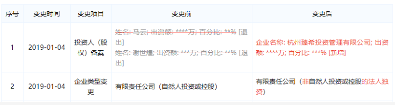 天眼查数据显示,1月4日,马云和谢世煌退出浙江淘宝网络有限公司股权备案,新增杭州臻希投资管理有限公司作为唯一股东。