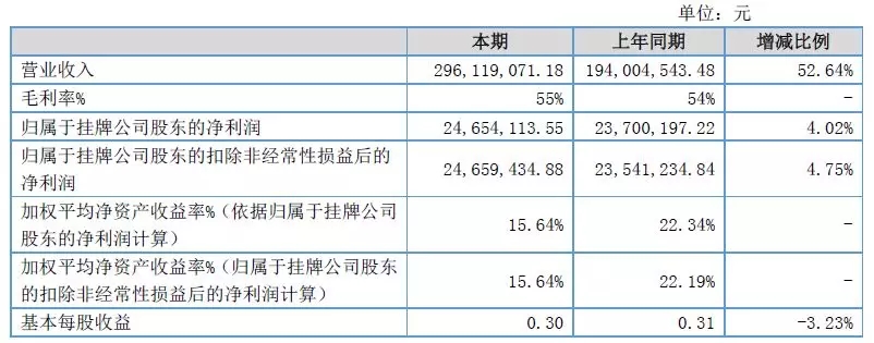 2017年,利美康营业收入2.96亿元,同比增长52.64%;净利润2466万元,同比增长4.02%,其毛利率近两年一直保持在50%以上。