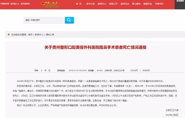 今天(1月7日)凌晨,贵阳市云岩区卫计局发布“关于贵州整形口腔美容外科医院隆鼻手术患者死亡情况通报”。