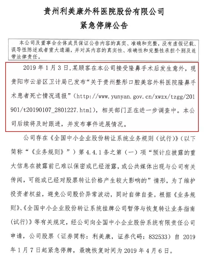 公告同时表示,“2019年1月3日,某顾客在本公司接受隆鼻手术后发生意外,相关部门正在进一步调查,本公司后续将及时跟进,并发布事件进展情况。”