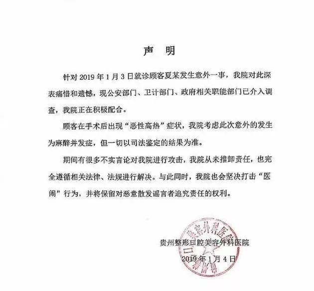 随后贵州整形口腔美容外科医院发表声明称:“顾客在手术后出现‘恶性高热’症状,我院考虑此次意外的发生为麻醉并发症,但一切以司法鉴定的结果为准。”