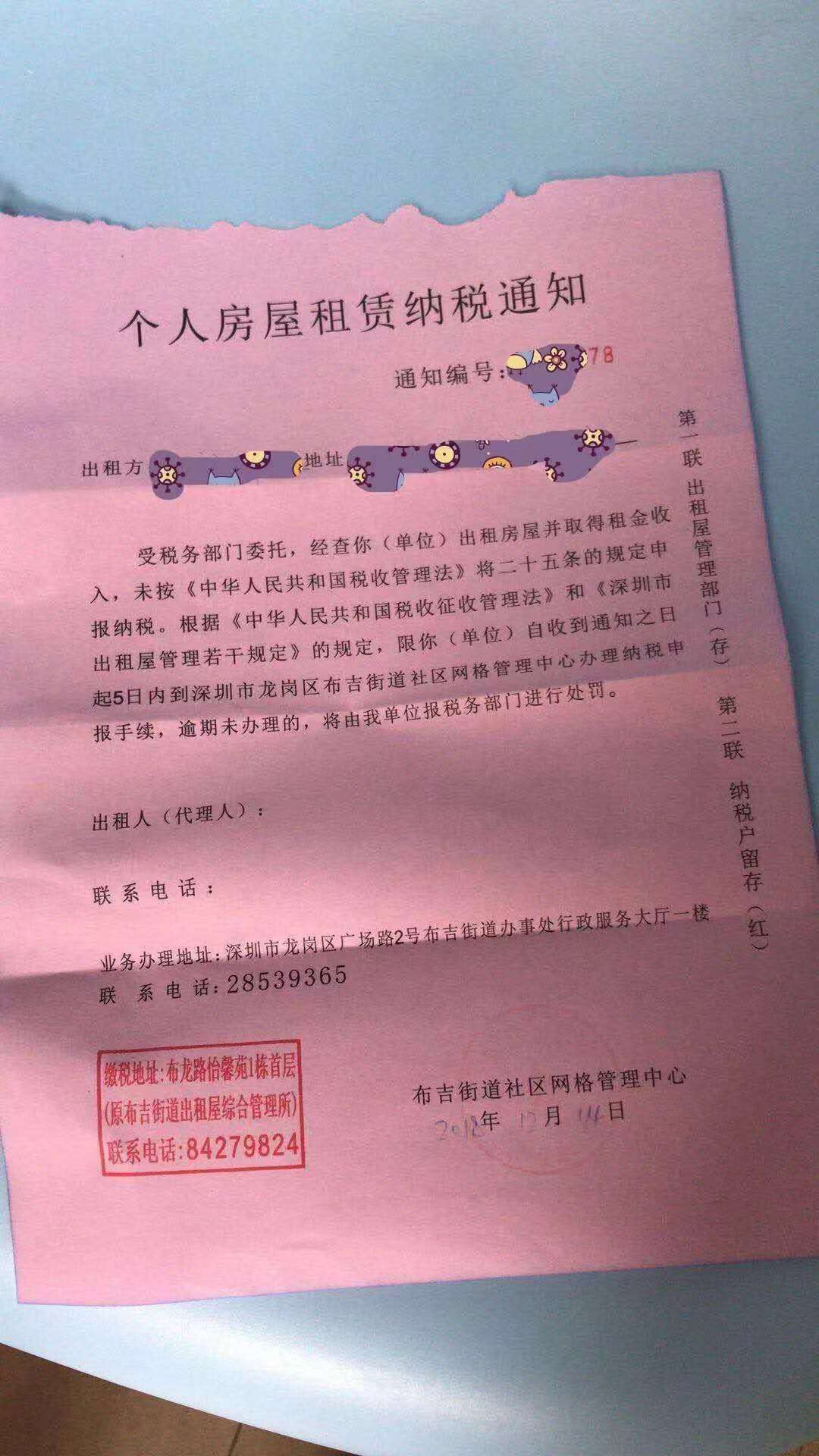 近日,网络上流传着一张图片——深圳市龙岗区布吉街道社区管理中心向出租方发出的《个人房屋租赁纳税通知》。