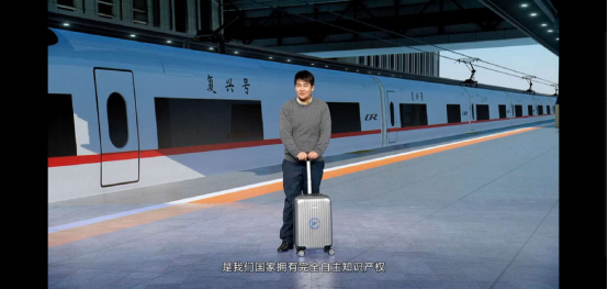 (由库菲为新华网打造的行李箱与象征中国速度的“复兴号”共同出镜)