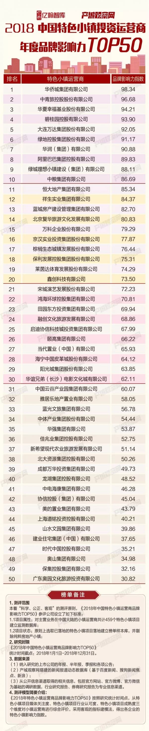 近日,由亿翰智库发布的“2018中国标杆产城&特色小镇运营商及项目品牌影响力TOP50”榜单中,华侨城集团在“2018特色小镇投资运营商年度品牌影响力TOP50”榜单中名列榜首;成都安仁古镇、深圳龙岗甘坑新镇、成都黄龙溪古镇在“2018中国特色小镇品牌影响力TOP50”榜单中均位居前列。