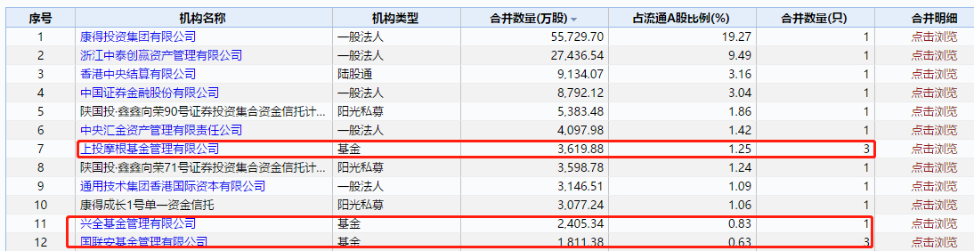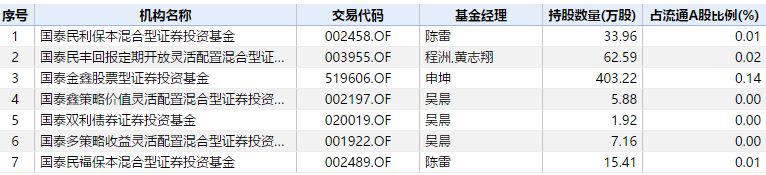 从基金公司合并数量来看,上投摩根基金持股数量最多,达3619.88万股,占流通A股比例为1.25%。紧随其后的是兴全基金和国联安基金,前者旗下1只产品(即兴全社会责任)持有2405.34万股,后者旗下3只产品合计持有1811.38万股。