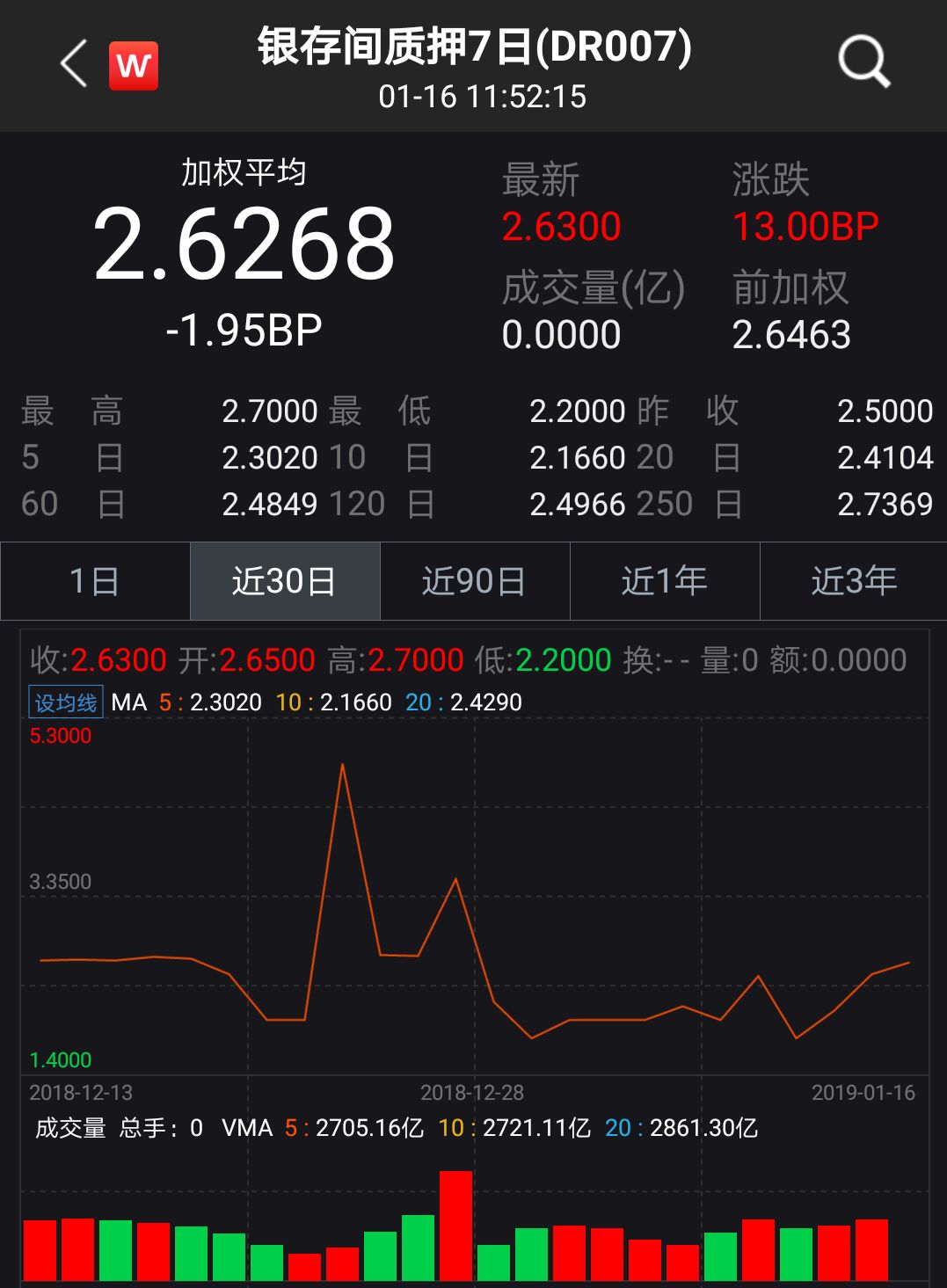 DR007在2019年初迎来一波显著下行,一度跌至2.21%,比央行今天开展的7天期逆回购操作(2.55%)低了超过30基点,说明当时流动性确实相当充裕。不过,DR007随后开始回升,本周连续上行,15日加权价报2.65%,已高于7天逆回购操作利率10bp。