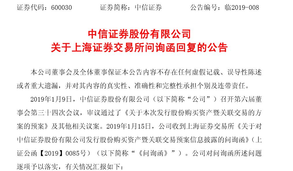 1月21日晚间,中信证券就上交所《关于对中信证券股份有限公司发行股份购买资产暨关联交易预案信息披露的问询函》进行回复,回复中将收购广州证券后如何解决同业竞争、如何安排员工等监管和市场关心的问题逐项予以说明。
