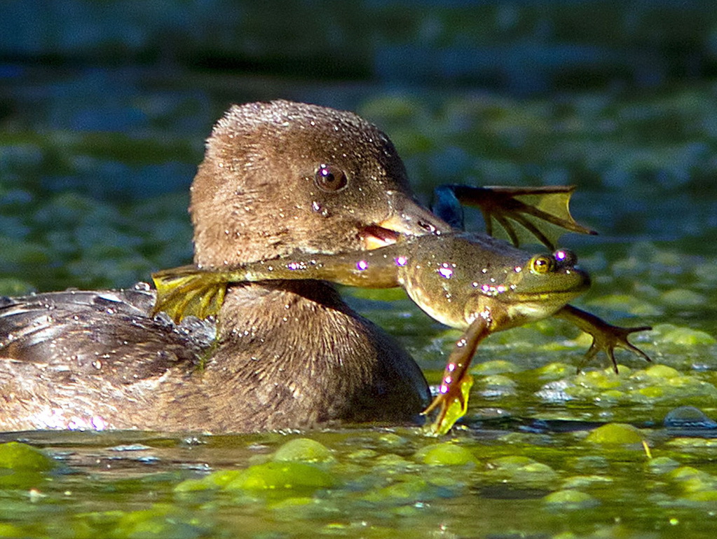动物的胃口到底有多大?它们可以吞咽下比自己身体大数倍的猎物,经常还是整个一口吞下肚不经任何咀嚼,那狼吞虎咽的气势令人胆寒。加拿大蒙特利尔,一只饥饿的鸭子四处觅食,牛蛙意识到危险迅速逃跑,不过还是被鸭子抓到了。虽然牛蛙的大小远远大于鸭子扁扁的嘴,但是鸭子还是十分顺利地吞咽了下去。