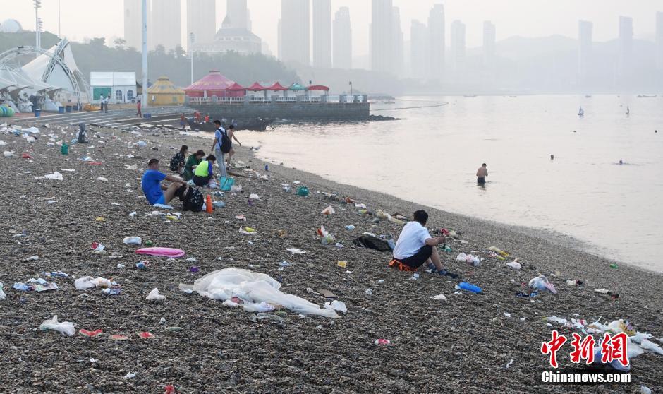 据中新社报道,2016年8月10日清晨,大连市开发区南砣子浴场岸边垃圾遍地。摄影:刘德斌