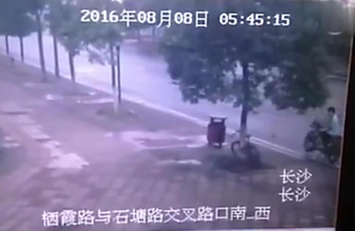 8月8日凌晨,一名环卫工在长沙县西霞路石塘路口清扫卫生时,发现有棵香樟树被锯断。相关部门调取监控发现,是一名男子为了取走锁在香樟树上的山地车,将树拦腰锯断。监控显示,8日早上5点半左右,一名身穿短衣短裤的男子骑着摩托车出现,男子将摩托车停稳后,手拿钢锯站在香樟树旁,开始动手锯树,锯了几下后离开现场。