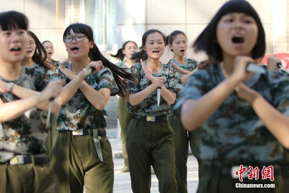 2016年9月7日,河南郑州,郑州大学为期2周的新生军训正在进行。而操场上最引人注目的,当属今年郑大新生军训首次设立的女子“匕首连”。与传统军训队列训练不同,这支由郑大外语学院、化学与工程学院129位女生组成的特殊队伍主要训练任务是匕首操。中新社发左冬辰 摄