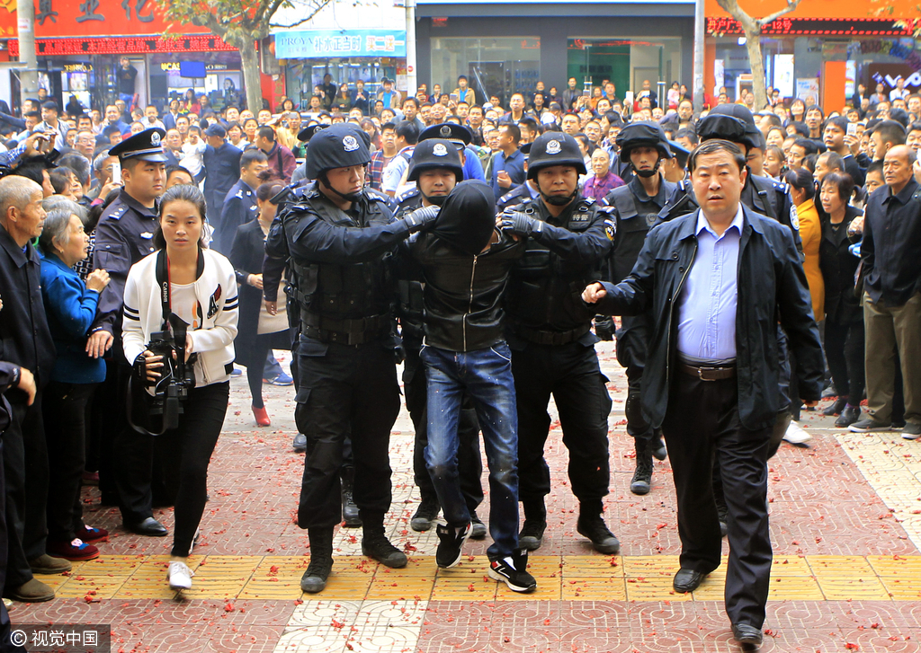 10月12日消息,11日上午10时许,陕西丹凤高速出口,丹凤县公安局多名警力严阵以待,等着押解5日凌晨洗劫丹凤县城时代购物中心的两名嫌疑人。不久,从洛南过来的警车到达,两嫌疑人蒙着头套,被押解到县公安局,随后被警方带到时代购物中心去指认现场。华商报曾春/视觉中国