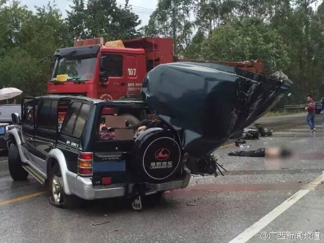 今早(10月19日)9点34分南宁交警接到警情报称:南宁七塘火葬场下坡路段(国道322线772KM+900M处)发生了一起严重的交通事故,一辆货车跟越野车发生碰撞,造成越野车被撞成“敞篷车”,导致5人死亡。