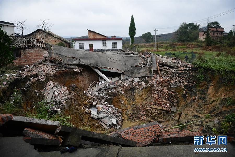 模沙村里,一处3层居民楼倒塌,房屋边出现一个大坑(11月24日摄)。