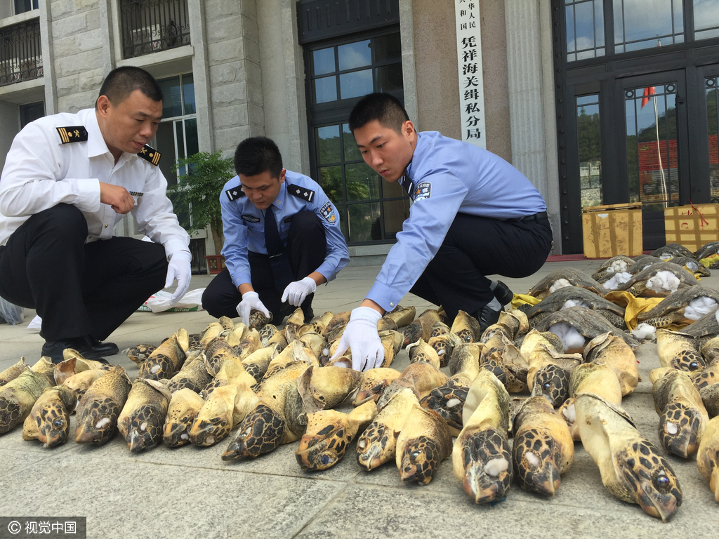 2016年11月25日报道,18日,广西壮族自治区崇左市,109只头身分离已被掏去内脏的玳瑁,17吨素有“贝类之王”的砗磲部分被七零八落地切割为块状;1100个外形独特美丽的唐冠螺……这些是南宁海关下属凭详海关在一起特大走私珍稀野生动物制品案中缴获的。来源:视觉中国