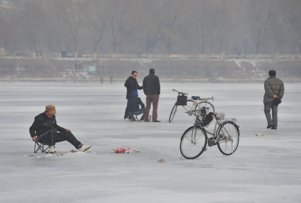 在沈阳浑河三好桥下游,很多垂钓者在冰面上开孔垂钓。为了应对寒风,有些人干脆在冰面上支起帐篷,在冰面上形成一个温暖的小屋,舒舒服服的玩起了冰钓。一些垂钓者钓上来的小鱼被直接从帐篷里扔出,抛弃在冰面上。(图:东方IC)