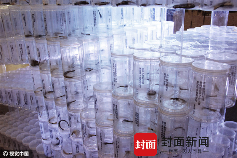 12月25日,在北京某大型商场中庭,展出了一个高达两米半的巨型艺术装置。这个装置由2061个装有白头发的瓶子组成,整体呈现出一个巨型的立体“家”字,孤独地耸立在商场地面上, 吸引了不少路人停驻观看。
