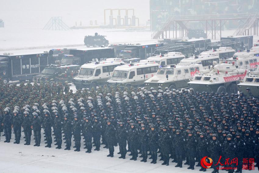 31日上午,新疆维吾尔自治区反恐维稳誓师大会在武警新疆总队训练基地隆重举行,驻疆武警部队、公安特警等千余名官兵参加誓师大会。图为反恐维稳誓师大会现场,驻疆武警部队、公安特警等千余名官兵参加誓师大会。马冰倩 摄