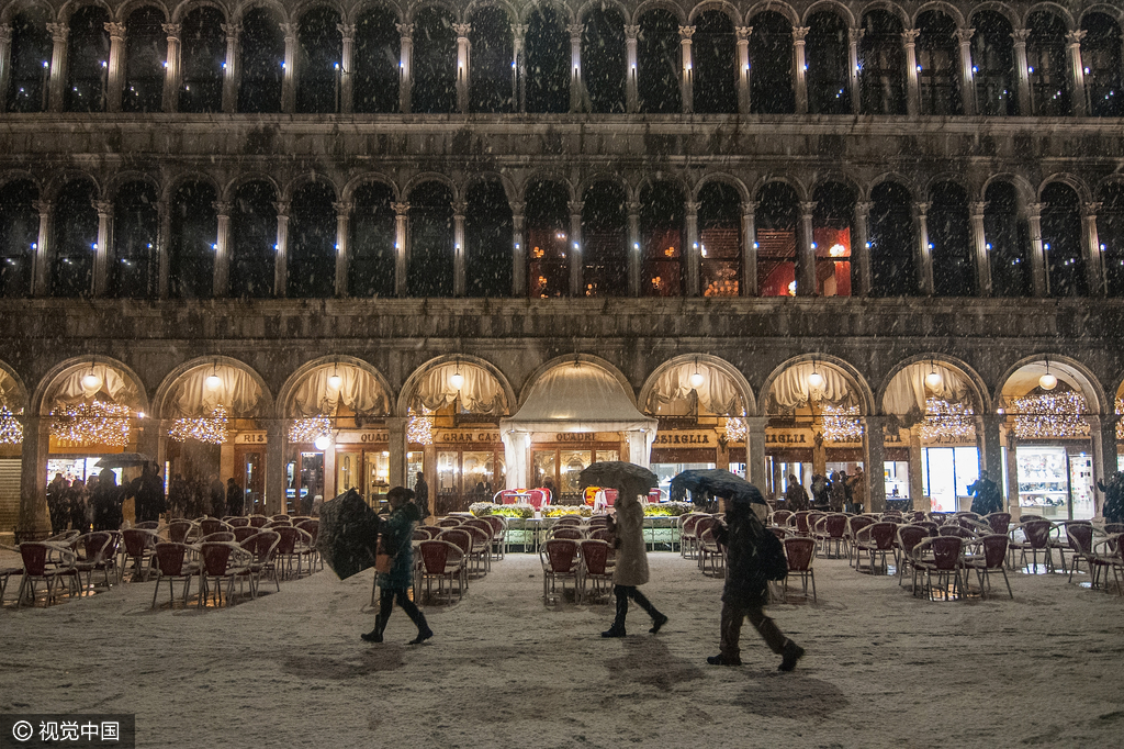 当地时间2017年1月13日,意大利威尼斯,“水城”威尼斯遭遇强降雪,整个意大利都处于严寒中。威尼斯(Venice)是意大利东北部著名的旅游与工业城市,也是威尼托地区的首府。
