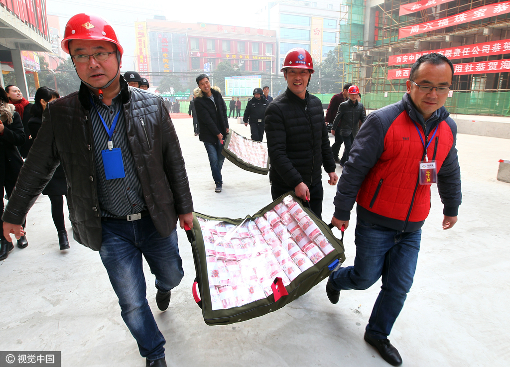 2017年1月18日,西安,在海福城项目工地内 ,300多名辛苦一年的农民工朋友领到属于自已的工资和资金。来源:视觉中国/三秦网
