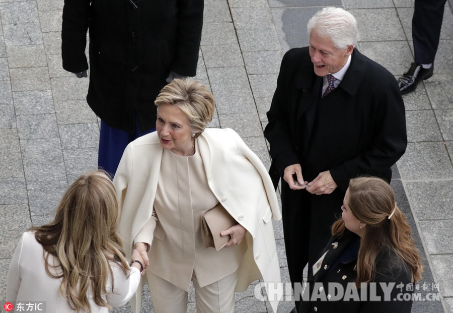 当地时间1月20日,美国新任总统特朗普的就职典礼即将举行。特朗普曾经的对手希拉里和丈夫克林顿现身国会,出席典礼。一身白衣的希拉里表情轻松。图为希拉里一身白衣现身国会大厦,出席特朗普就职典礼。
