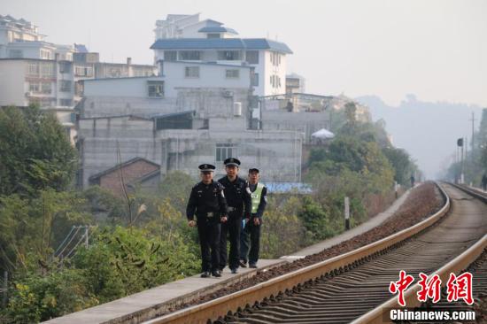 1月23日,年轻的广西柳州铁路公安处融水派出所见习警察易峰在焦柳铁路线融水路段巡查。随着广西高铁的快速发展和普及,大部分铁路都设有防护网禁止人畜穿行,但在焦柳铁路融水段,是南宁铁路局唯一沿线无防护网的老铁路线,仍需铁警每天沿线步行开展安全检查、巡查线路、路外安全宣传等工作。在春运期间,过境客流量的增长和务工群众回乡过节,让铁警的工作量比平时翻了一倍。图为铁警在老铁路沿线巡查。夏阳春摄