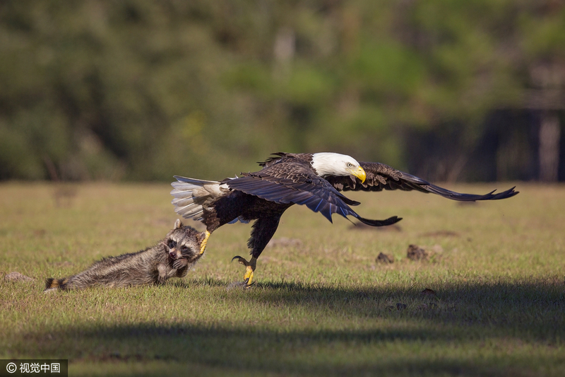 2017年1月23日讯,美国佛罗里达州沃卢夏县,摄影师LynnKohut拍摄到一只鹰试图抓浣熊的过程。鹰抓住浣熊的脖子想把浣熊抓住,但是反遭浣熊拖住腿。LynnKohut/视觉中国