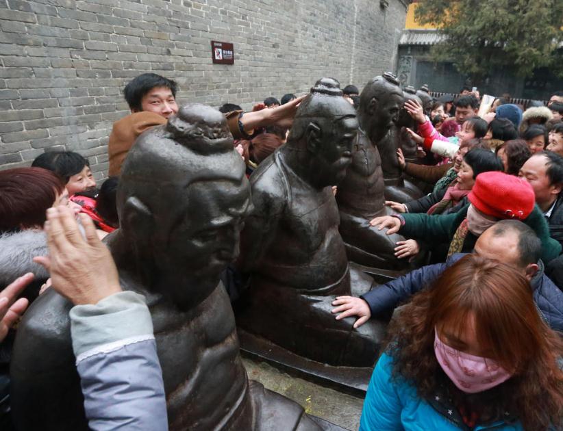 1月28日,河南淮阳,在太昊陵烧新春第一香归来的民众来到岳飞观前排队“打秦桧”。杨正华/视觉中国