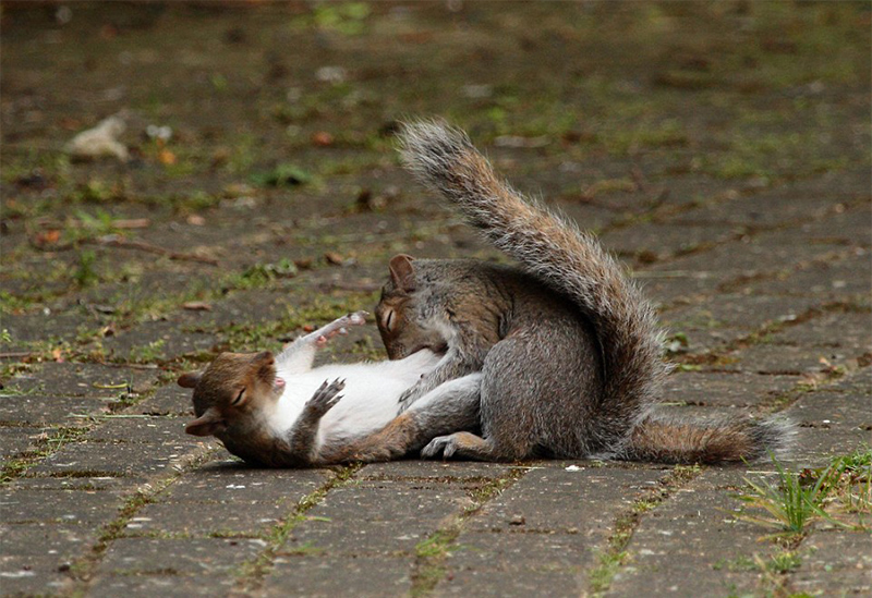 来自伦敦的47岁的Martin Docker在后花园里捕捉到了两只松鼠的决斗,它们戏剧性的打斗有时似摔跤,有时似柔道,有时还似忍者间的决斗。