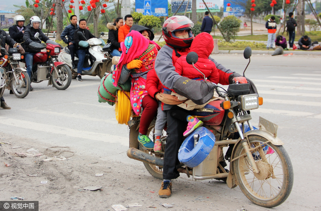 2017年2月3日,在粤桂交界的广西梧州市藤县路段,一辆摩托车居然搭乘了5个人,父母的胸前各自用安全带“绑”着一个孩子,两人当中还“夹”着一个孩子。在滚滚的车流中,这辆严重超载的“铁骑”还要跋涉三四百公里才能抵达广东,令人心惊胆战。甘汉深/视觉中国