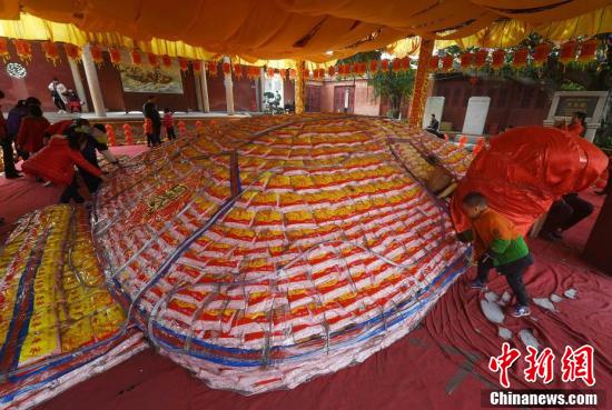 2月10日,民众们不停地用双手抚摸“米龟”一周。由一万多袋5斤装的大米垒成,重达53500斤的“米龟”亮相福建泉州天后宫,吸引许多市民和游客前来观赏。中新社记者张斌摄