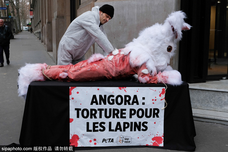 当地时间2017年2月9日,法国巴黎,动物保护组织活动家当日举行抗议活动,现场表演人类为了获得安哥拉兔毛,生剥兔子皮毛。